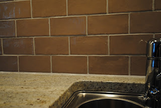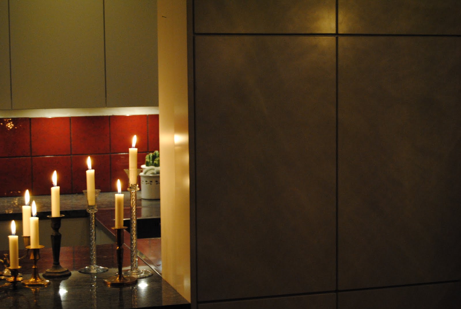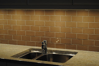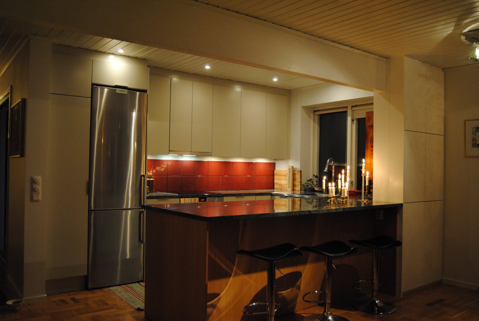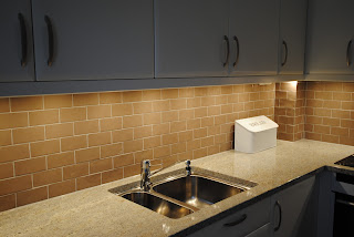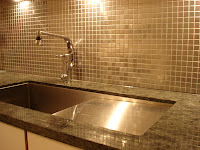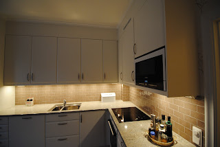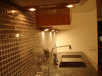 Belysning över diskho, som speglar sig i mosaiken. Spotlightsen är placerade in mot vägg och ger bra arbetsljus.