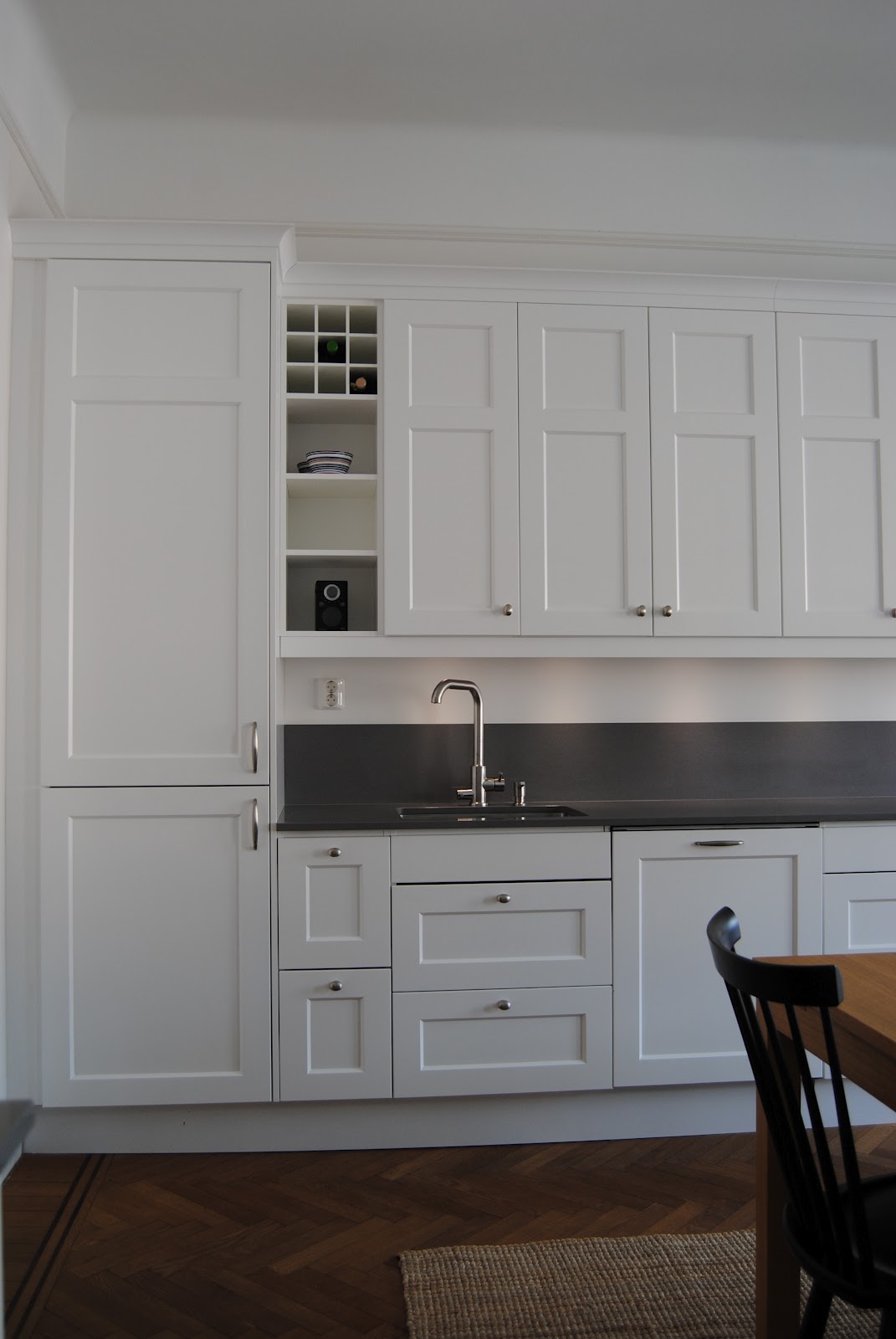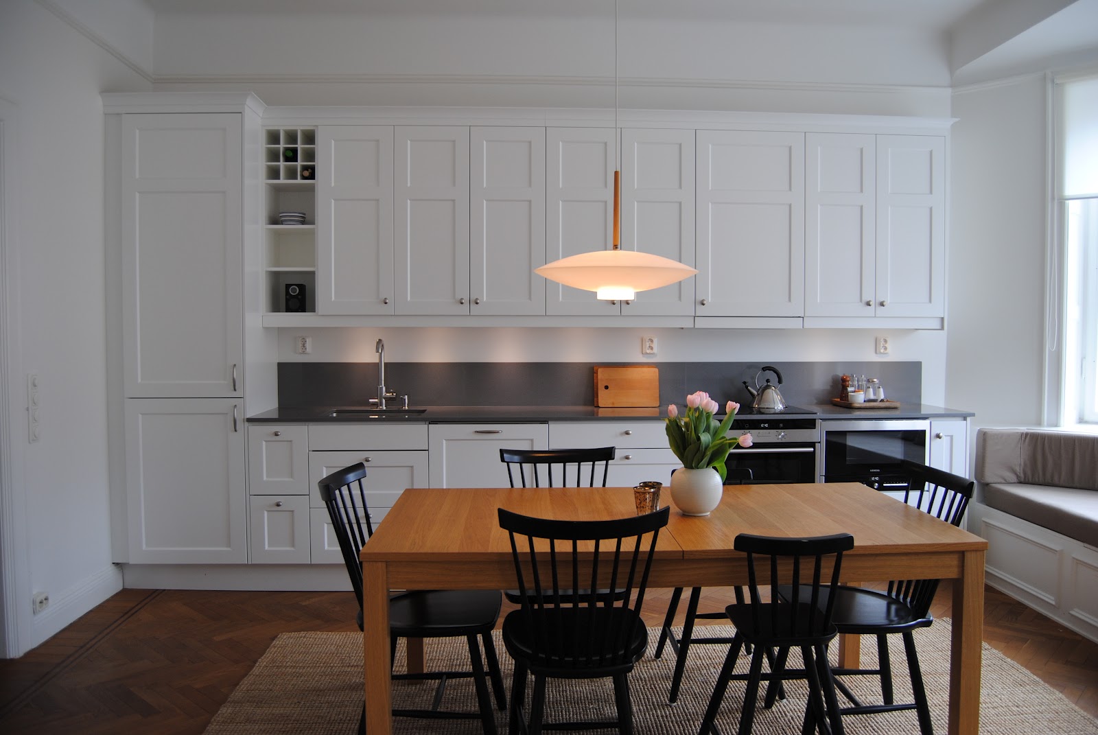 Mörkt trä eller laminat känns väldigt snyggt och stiligt för den som vågar välja något annat än vitt. Här blir det en aning asiatisk ton. Läckert!