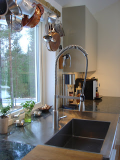 Köket går i dova naturfärger, och har en skön känsla. Granitskivor som går i skyar av grönt och grått, påminner om ett vilt djur. Familjens lurviga katt får konkurrens. Mikrovågsugnen sitter under bänk, och göms därmed, och köket smälter in i rummet, utan att kännas för mycket kök.