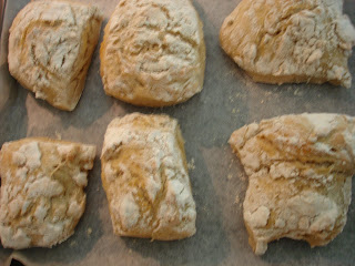 Sätt ugnen på 250 grader. Strö rikligt med mjöl på bakbordet. Stjälp upp degen. KNÅDA EJ! Dra ut degen till en rektangel och skär ut 3 st remsor med en degskrapa, skär sedan varje remsa i 5 st delar. Lägg degbitarna på bakplåtspapper. Grädda direkt i ca. 15-17 minuter. Låt svalna.