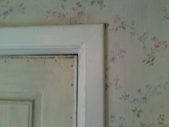 Dörrarna på dessa bilderna är från en tid när allmoge var det man hade. På 50-talet var detta omodernt och funkis hade blivit accepterat, även på landet. På bilden till höger ser ni att den är spikhål runt dörren, där satt masonitskivor fastspikade. Bilden i mitten har stora lagningar, men talar för en tid så det inte fanns snabbväxande virke. Dörren till vänster är alla speglar huggna med yxa för att masoniten skulle spikas på, för att ge en nytt grepp i den gamla huset, eller om det inte var så viktigt med speglar bakom dörren?